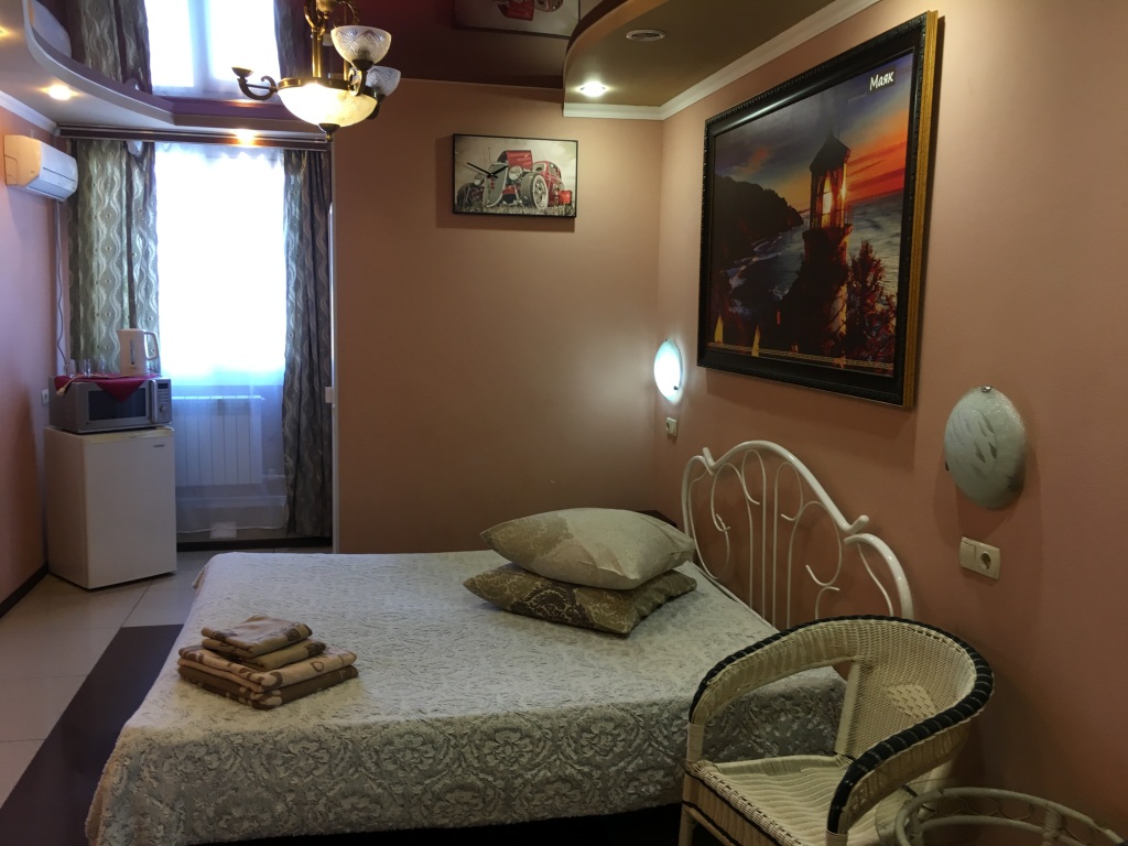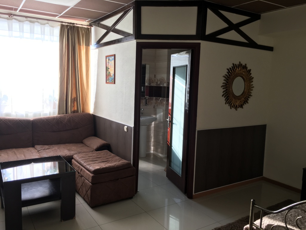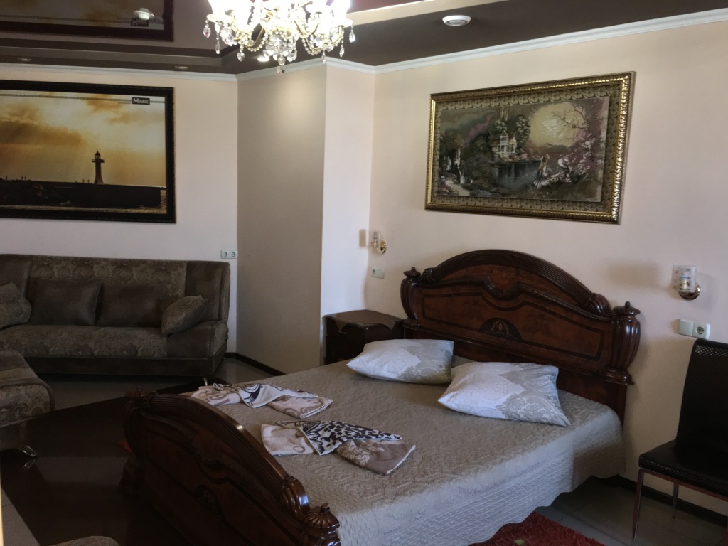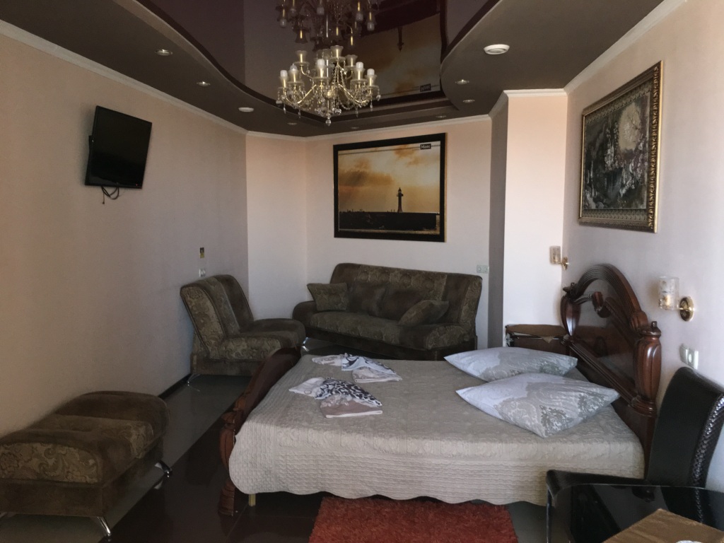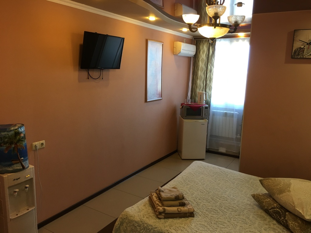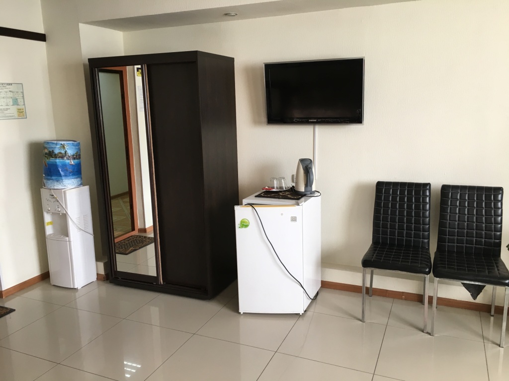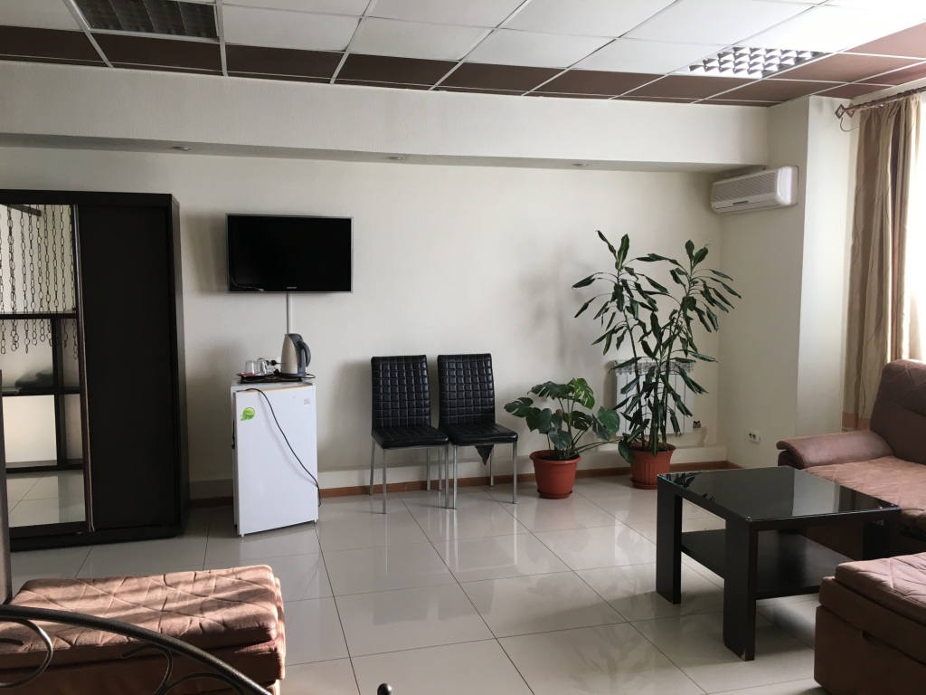 Диван, душ и туалет в номере. В номере есть шкаф, тумбочки, чайник, холодильник, кондиционер и телевизор.