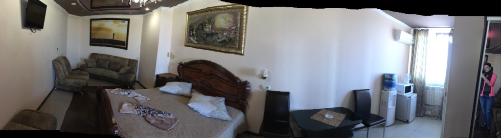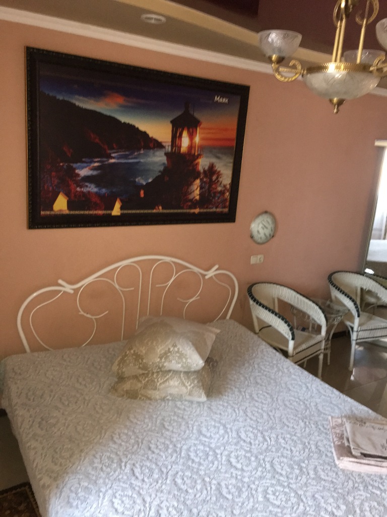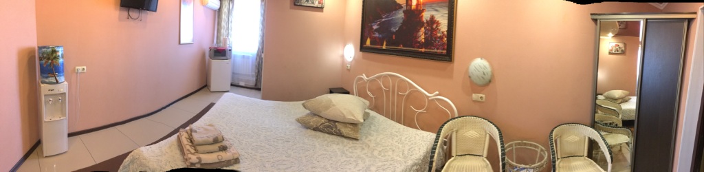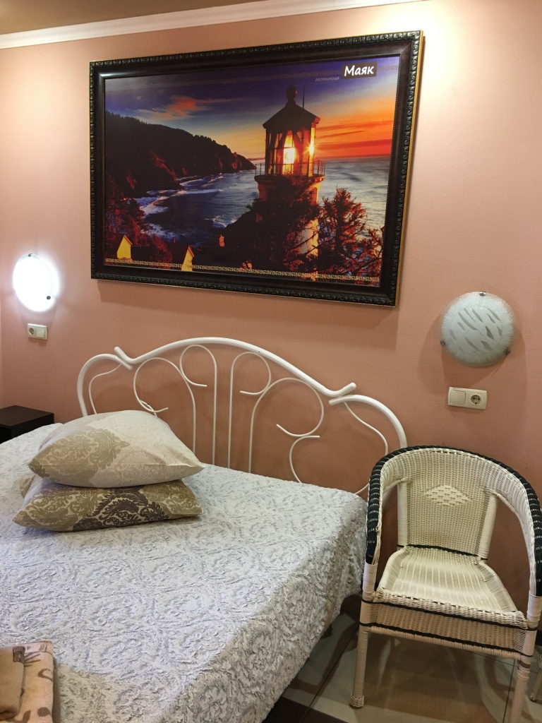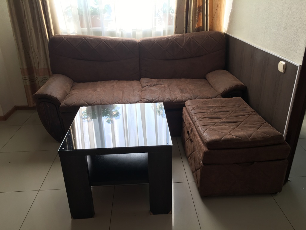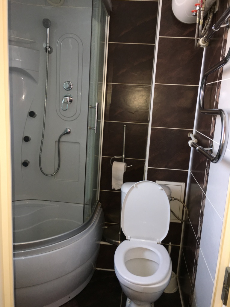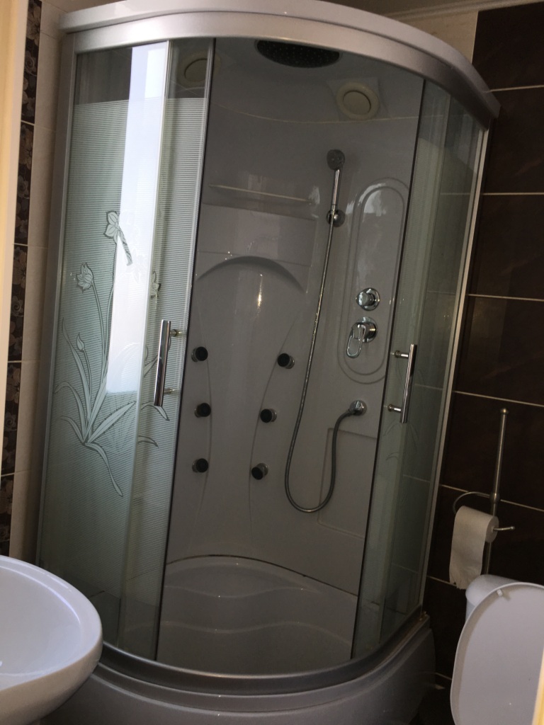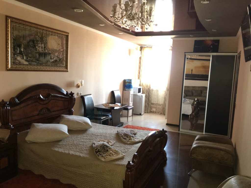 Диван, душ и туалет в номере. В номере есть шкаф, тумбочки, чайник, холодильник, кондиционер и телевизор.