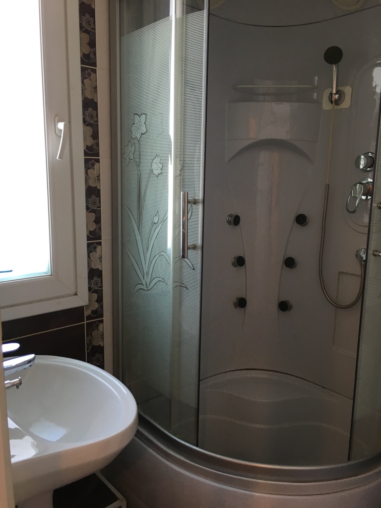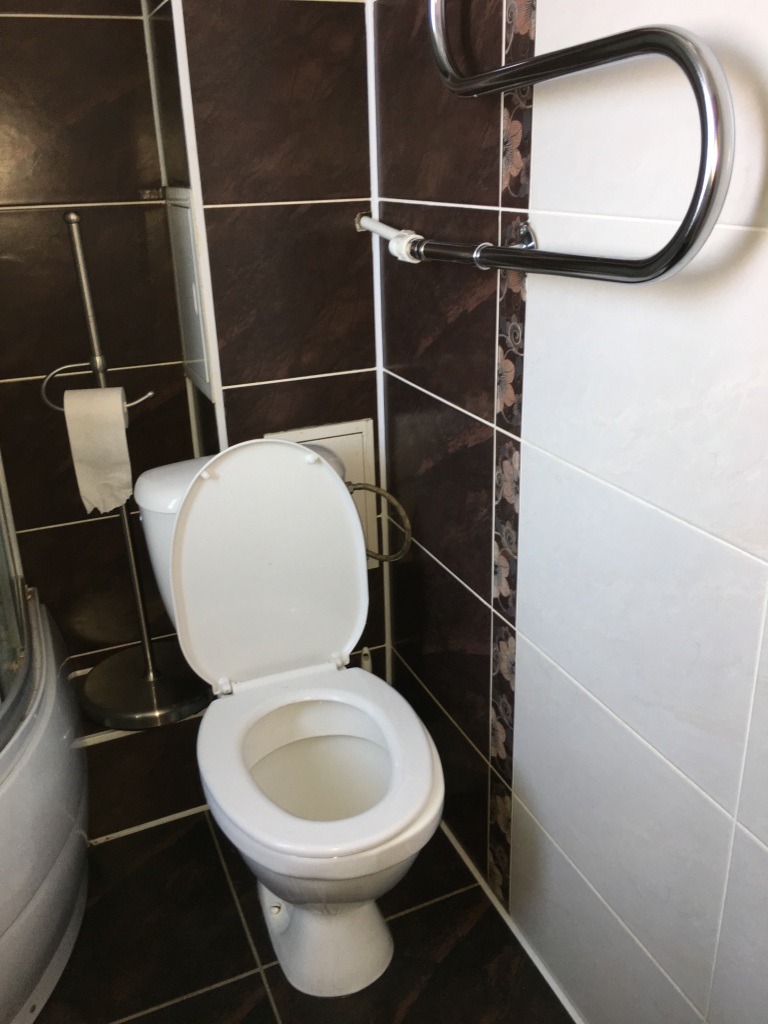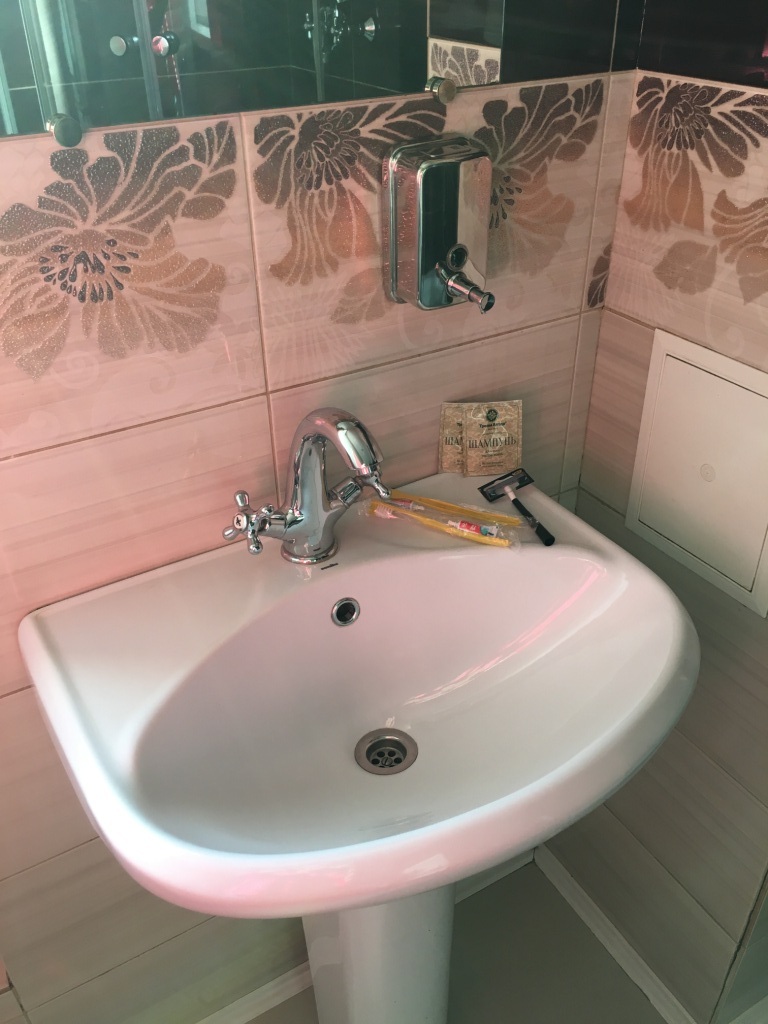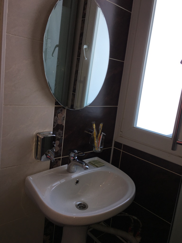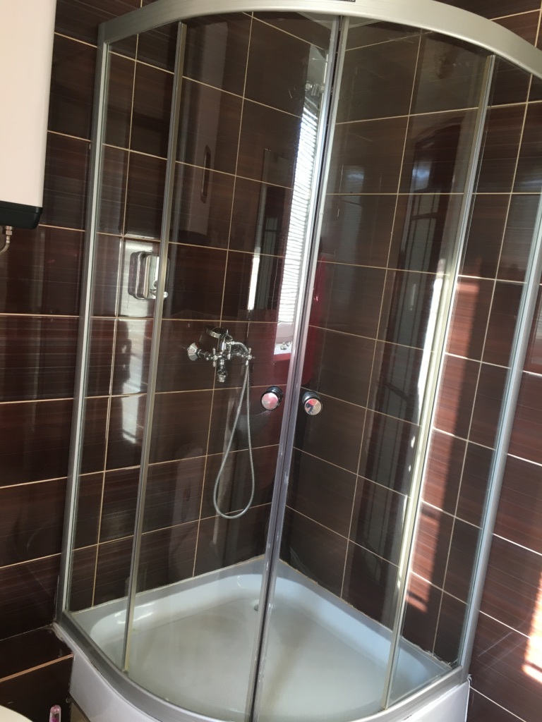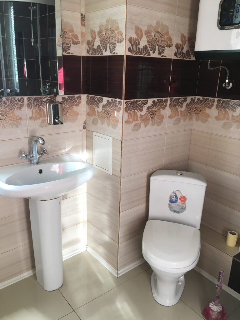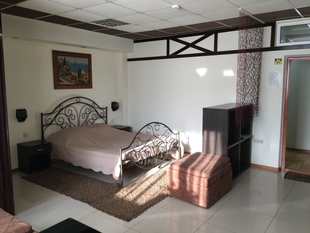 Диван, душ и туалет в номере. В номере есть шкаф, тумбочки, чайник, холодильник, кондиционер и телевизор.